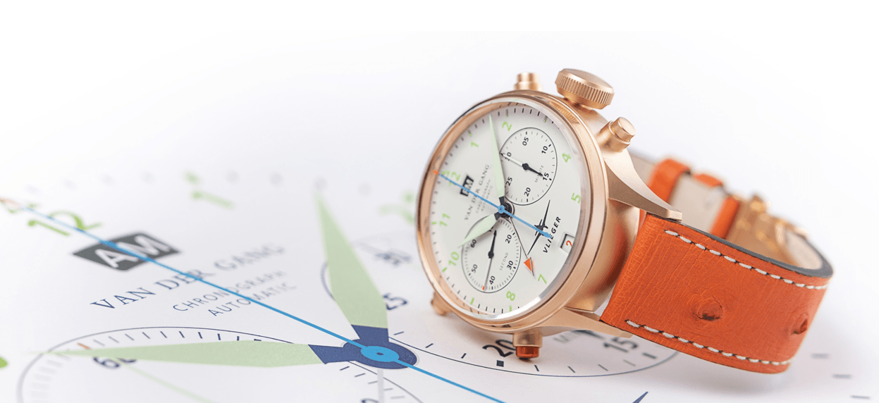 In het gamma van Van der Gang vind je 5 horloges om uit te kiezen. Ter ere van de 5de verjaardag van ‘De Vlieger’, is er een gelimiteerde oplage van 99 exemplaren op de markt gekomen. Een horloge met een 18-karaats gouden kast om duimen en vingers bij af te likken. De matte, gesatineerde kast springt er uit, al moet de opvallende oranje band er niet voor onderdoen. Een klokje waarmee je opvalt, dat is duidelijk.