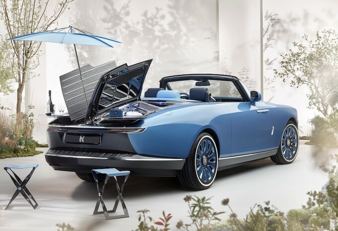 Een jacht op wielen, anders kunnen we het niet omschrijven, die Rolls-Royce Boat Tail. Met zijn achterdek inclusief koelkasten, uitklapbare parasol en krukjes uit carbon voel je je als kapitein op een luxejacht.