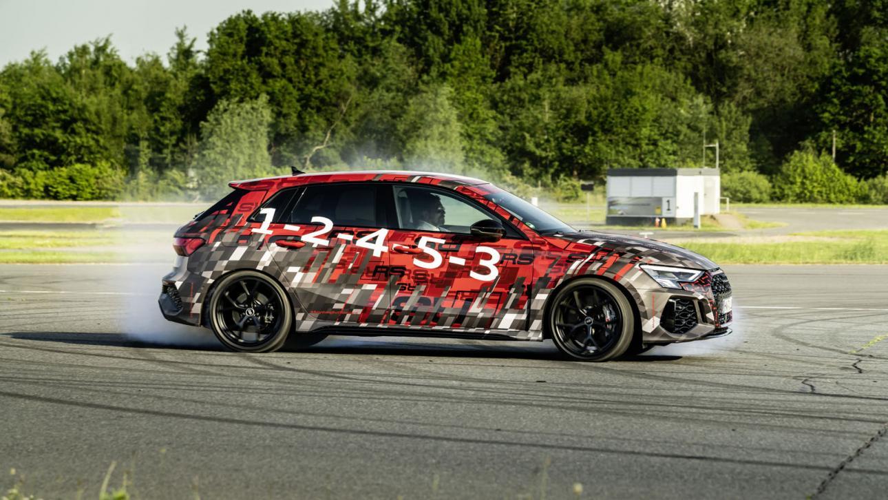 Audi heeft zonet de spes van zijn nieuwe RS3 bekend gemaakt. En wie de gecamoufleerde exemplaren bekijkt, ziet de cijfers 1-2-3-4-5 staan op de flank. Dat is niet het aantal seconden dat deze krachtige Audi naar 100 seconden spurt, dat doet ie overigens ‘launch control gewijd’ in 3,8 seconden, wel de verwijzing naar de ontstekingsvolgorde van de 2,5 liter vijfpitter met turbo.