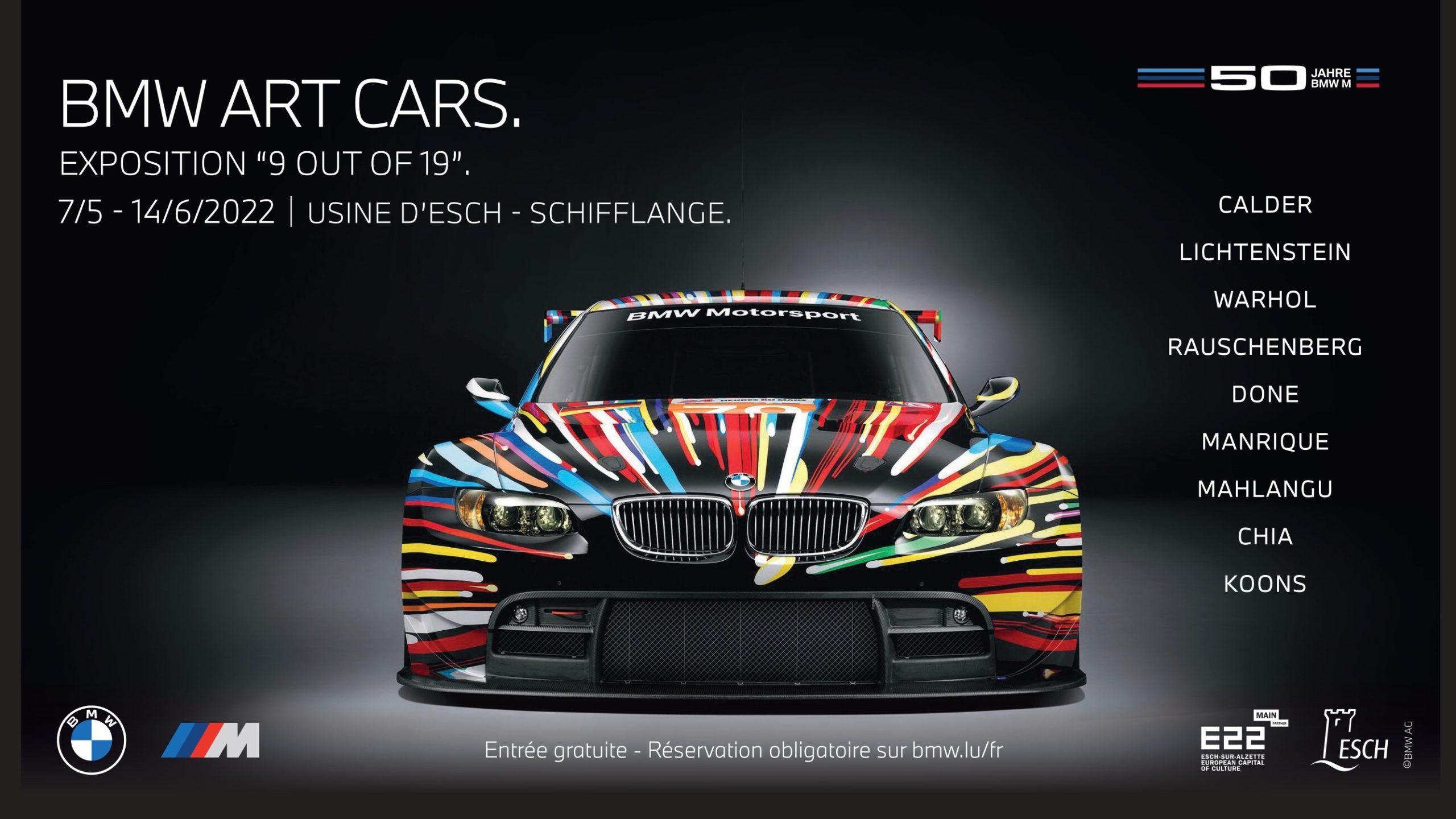 Als resultaat van de samenwerking tussen Esch2022, Europese Hoofdstad van Cultuur en BMW Group Belux, zullen van 7 mei tot 14 juni niet minder dan 9 legendarische BMW Art Cars tentoongesteld worden in de staalfabriek AES in Esch-Sur Alzette, Luxemburg.