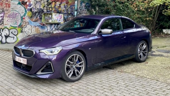 Wat het design betreft is hij een pak minder opzichtig als de M2 al verloochend hij zijn sportieve en dynamische karakter helemaal niet. Zo zien we een gespierde front, subtiele spoiler op de kofferklep, M-spiegels, M-velgen en wat ons testexemplaar betreft, een iets opzichtigere paarse metaalkleur.