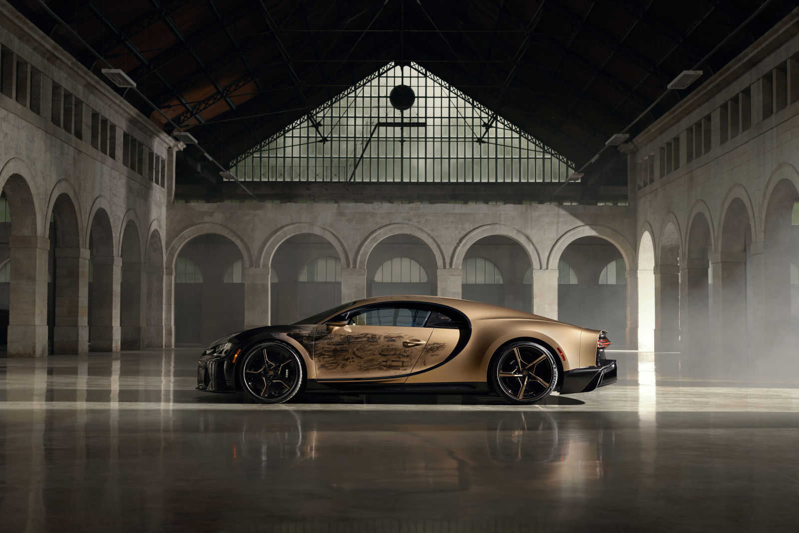 Speciale dingen aan dit exemplaar vinden we niet onderhuids, die blijft ook hier zijn W16 van 1.600 pk trouw, wel de lak. Zo liet de klant zowat heel de geschiedenis van het merk met de hand én in potlood op de auto tekenen waaronder 26 schetsen van vooral vooroorlogse modellen op de passagierskant terwijl je aan de bestuurderskant de heropleving van Bugatti na 1987 terugvindt met de EB110, de Veyron, de Divo, de Centodieci, La Voiture Noire en, uiteraard, de Chiron. Dit alles goed voor zo’n 400 uur aan tekenwerk. Tekenwerk dat geflankeerd wordt met een diepzwarte neus die overgaat tot een gouden achterkant.