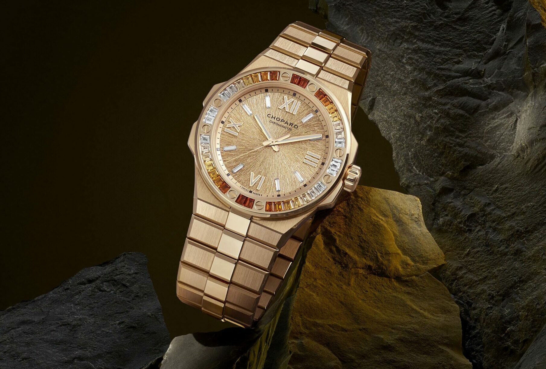 De iconische en stijlvolle Alpine Eagle collectie van het Zwitserse horloge- en juwelenhuis Chopard is uitgebreid met vier nieuwe, sprankelende modellen. De duurzame, luxe sporthorloges hebben een 41 mm kast en geïntegreerde band van 18 karaat ethisch verantwoord geel-, wit- of roségoud. De ronde lunette is bezet met 36 gekleurde en trapeze geslepen edelstenen. Met een rotsachtige textuur weerspiegelt de intrigerende en stralende wijzerplaat de iris van een arendsoog.