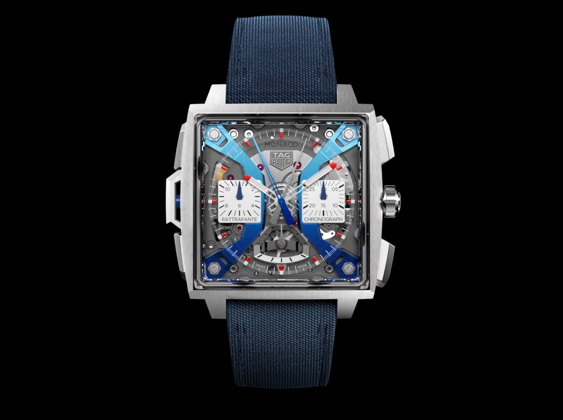 Wat ons het eerste opvalt van deze horloge uit misschien wel de meest iconische reeks van het Zwitserse merk zijn enkele stilistische en materiële veranderingen aan dit horloge. Zo ligt de focus op een opengewerkte esthetiek die de aandacht vestigt op de mechanica van dit horloge, en dat komt omdat dit de eerste mechanische splitseconds chronograaf is die het merk ooit heeft gemaakt. Hiervoor moest Tag Heuer een geheel nieuw uurwerk ontwikkelen in samenwerking met Vaucher Manufacture Fleurier met als ultieme doel aandacht te vestigen op het nieuwe TH81-00 kaliber. Dat betekent een caseback die volledig van saffier is gemaakt en die de indruk wekt dat de trillende massa vrij zweeft. Die massa is uitgevoerd in de TAG Heuer schildvorm en is met de hand geschilderd in een rood of blauw kleurverloop, afhankelijk van de kleur van het horloge.