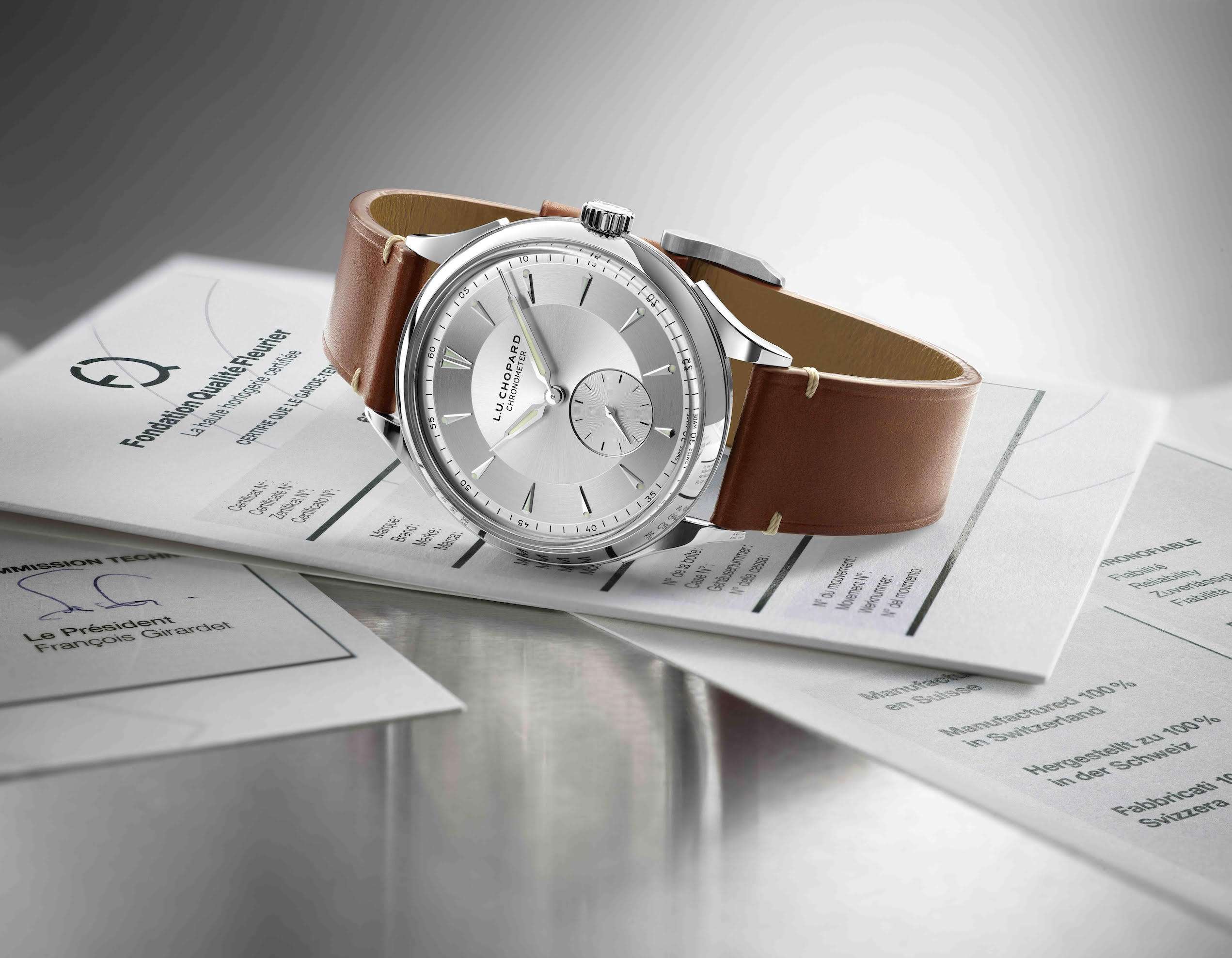 Het Zwitserse horlogehuis Chopard presenteert een nieuwe, luxe dress watch in duurzaam staal. Met zijn puur design is de L.U.C Qualité Fleurier een toonbeeld van ingetogen elegantie. Het stijlvolle en functionele horloge is voorzien van een zilverkleurige, monochrome sector wijzerplaat met een kleine secondewijzer op 6 uur. De klassieke wijzers en opgelegde uurindexen zijn rhodium-plated en lichtgevend. De comfortabele casual band is van bruin kalfsleer met beige stiksel.