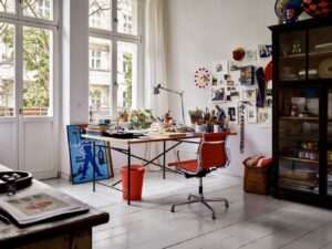 Vitra_Aluminium-Chair-EA-131_132-Track-brick_dark-red-Ball-Clock—HSFW-Limited-Edition–2024–Happy-Bin-RE-L-Poppy-Red-9132560