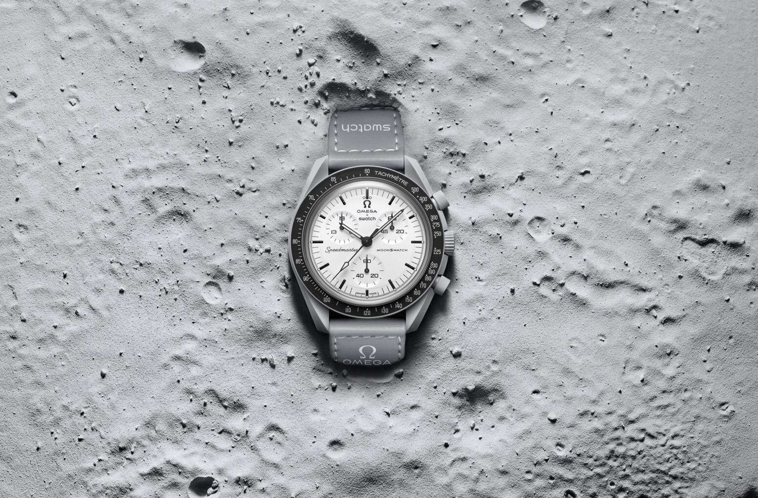 De twee tellers op 10 en 2 uur op de nieuwe MOONSWATCH 1965 zijn ook nieuw. De eerste geeft bovenaan het getal 19 (normaal 60) weer, terwijl de andere het getal 65 (normaal 10) weergeeft, verwijzend naar het jaar 1965.