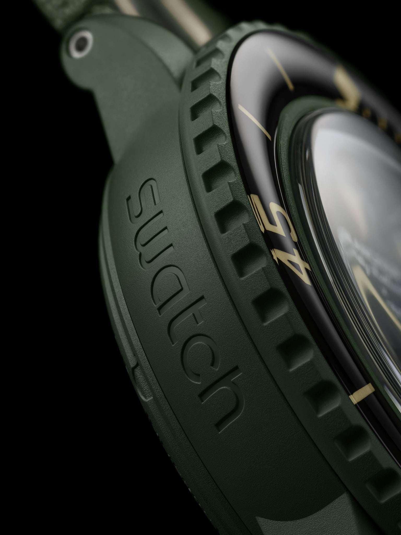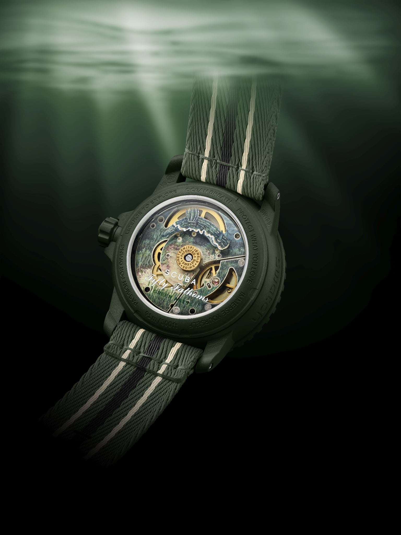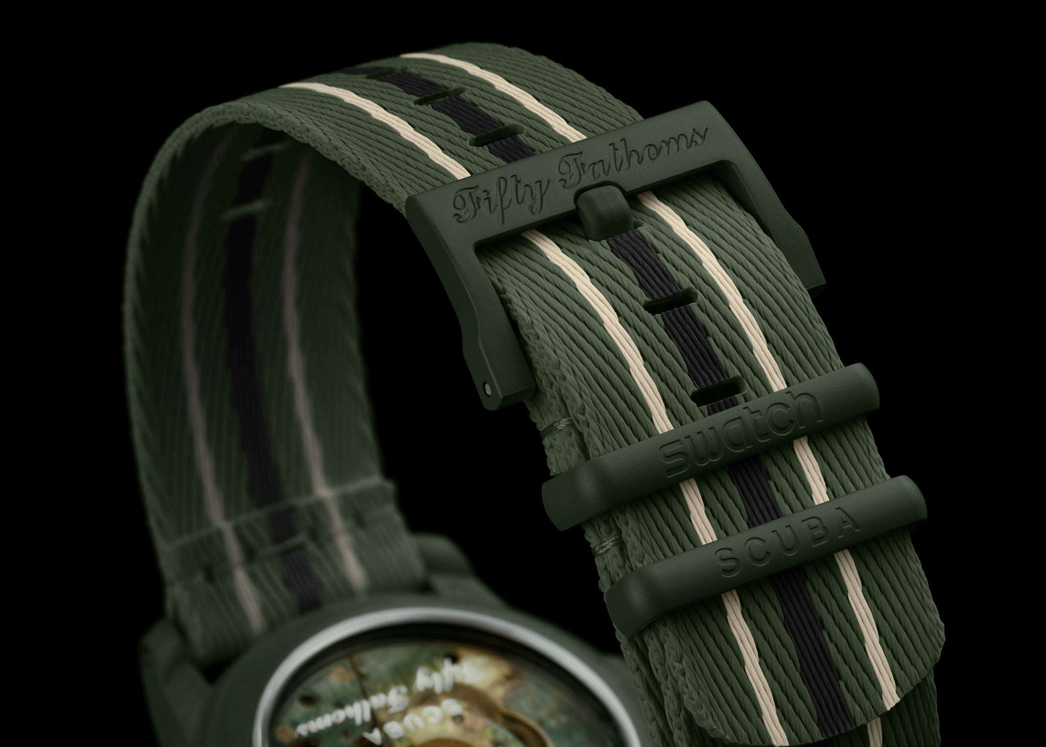De GREEN ABYSS heeft alles wat je wil: een vintage Blancpain-logo, het Swatch x Blancpain-teken op de kroon, en een stevige NATO-stijl band voor het serieuze werk. En vergeet de slogans op de achterkant niet – “PROTECT WHAT YOU LOVE”, “LICENSE TO EXPLORE”, en onze favoriet: “OCEAN BREATH”. Klinkt als een James Bond-film die we zouden willen zien.
