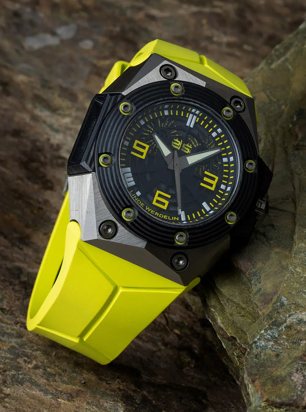 Twee redenen. Eén: in 2012 lanceerde Linde Werdelin de Oktopus II in een uitvoering met gele details. Alle 88 exemplaren waren in no time verkocht. Sindsdien is dit model een van de meest gezochte stukken op de tweedehandsmarkt.