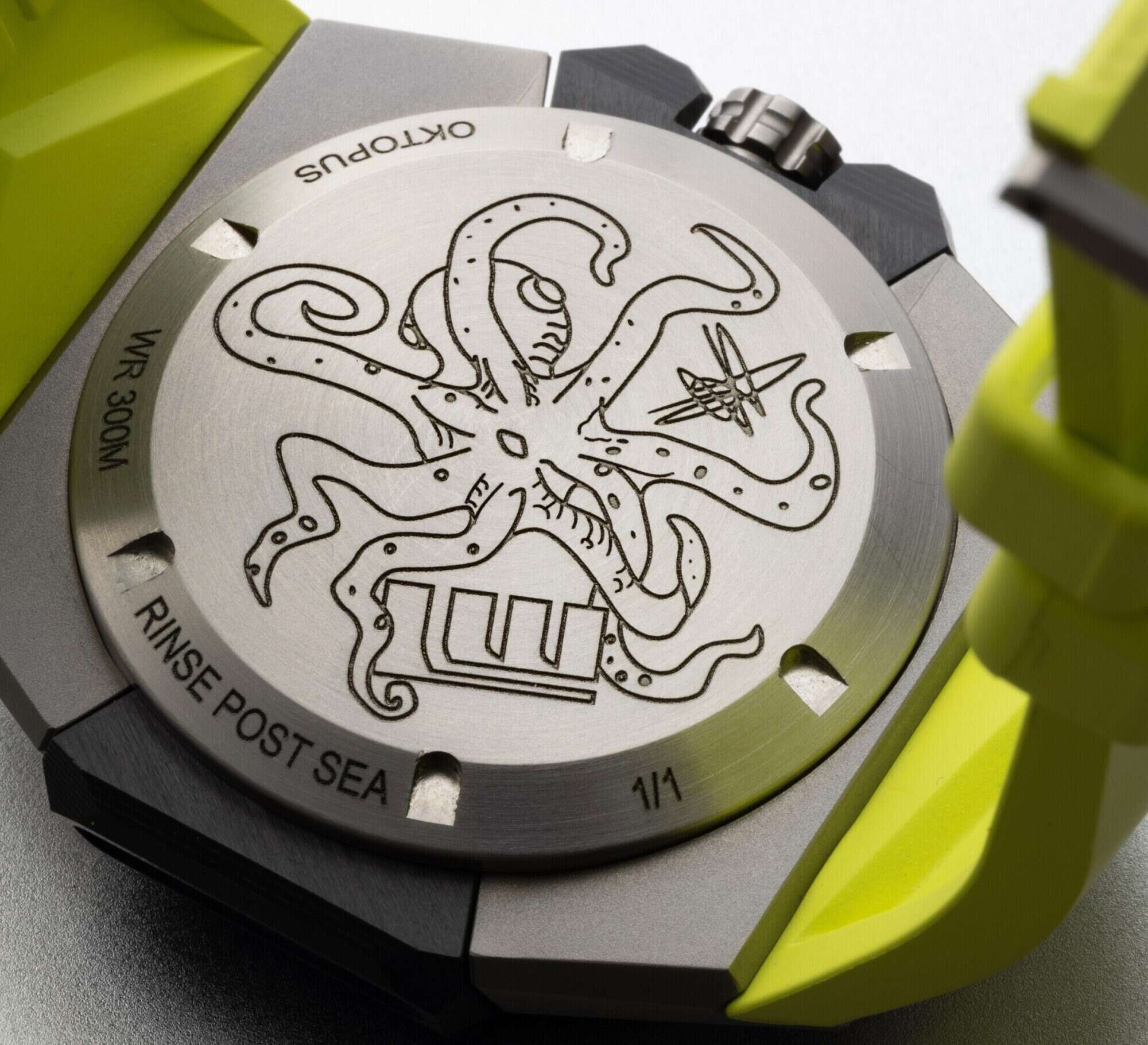 Details: gele tension discs op carbon bezel, octopus gravures, stevige titanium afwerking met satin & microbillé