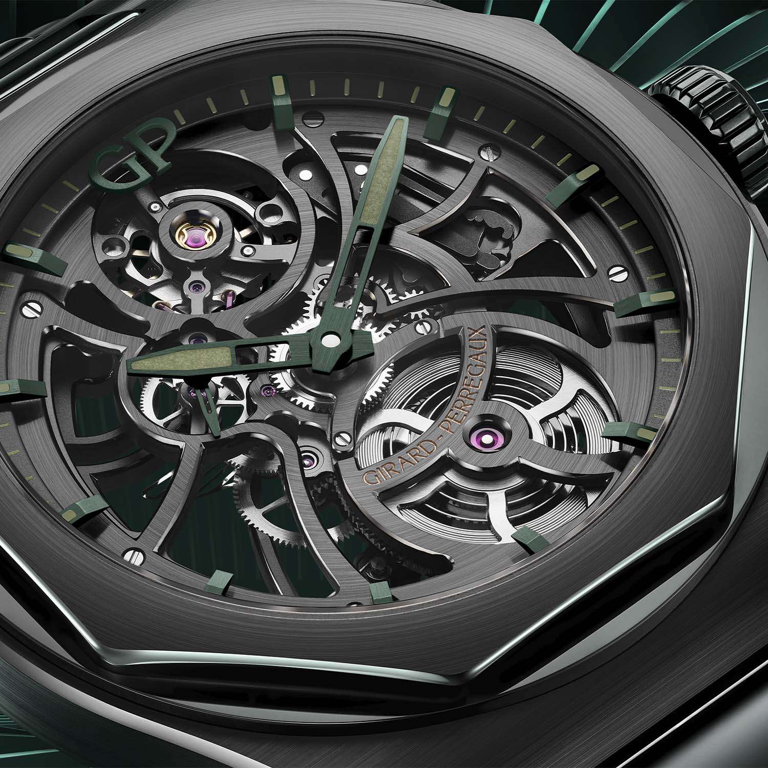 Wat meteen opvalt? De skeletonized wijzerplaat met felgroene details in Aston Martin’s legendarische Racing Green. Zelfs in het donker blijft het horloge goed leesbaar, terwijl je onder de saffierkristallen kap een inkijk krijgt in de mechanische magie van het GP01800-kaliber. Denk: 55 handgepolijste hoeken, zwarte PVD-afwerking en een opengewerkte rotor in goud. Pure horlogeporno.