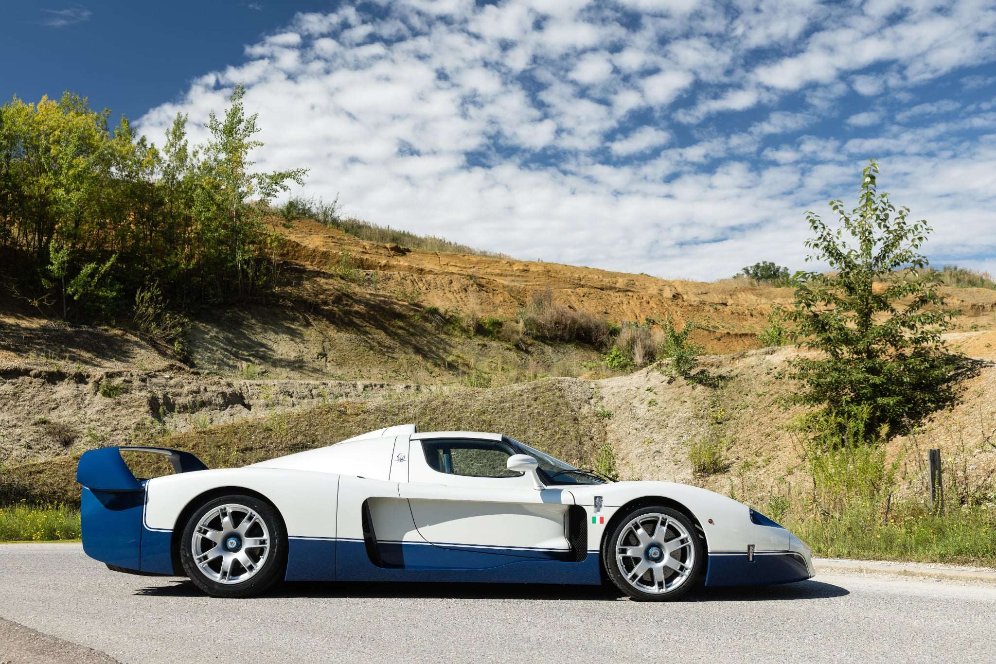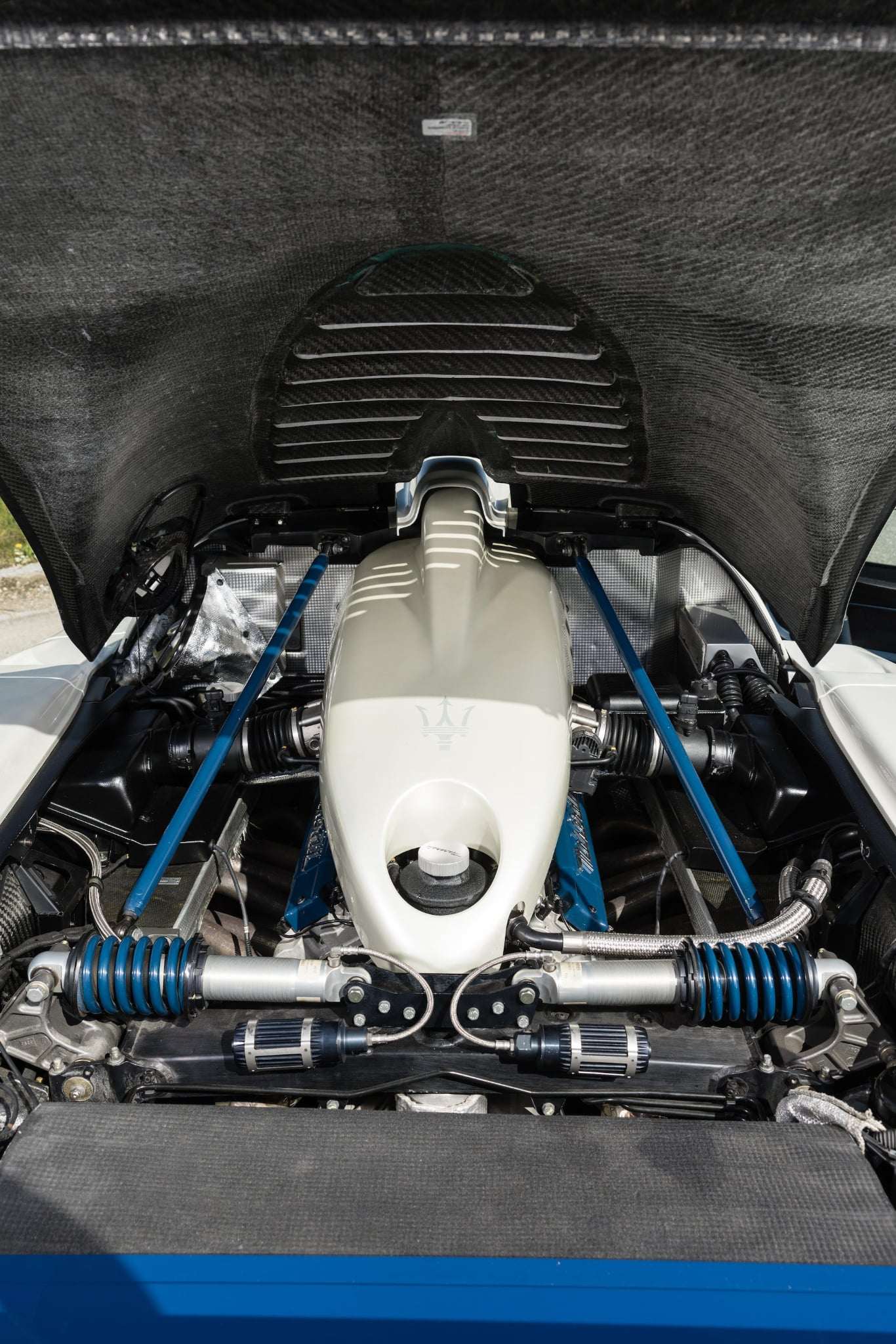 Het exemplaar in Knokke dateert uit 2005, het jaar waarin Maserati de zogeheten shortnose-variant introduceerde. Die kreeg een neusje dat 150 millimeter korter was om te voldoen aan FIA-regels. Onderhuids is hij nauw verwant aan de Ferrari Enzo, maar qua looks heeft Maserati er volledig zijn eigen draai aan gegeven.