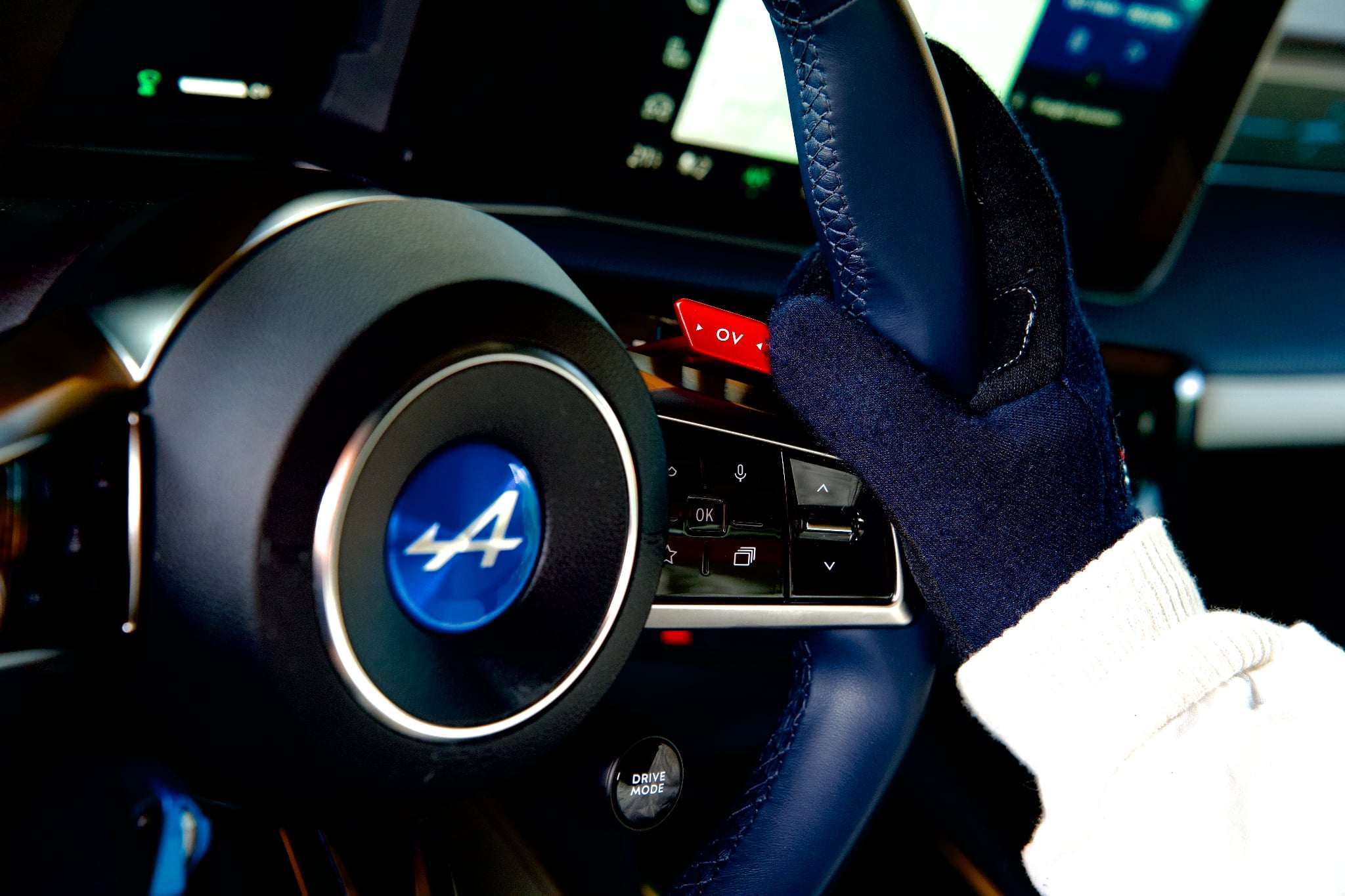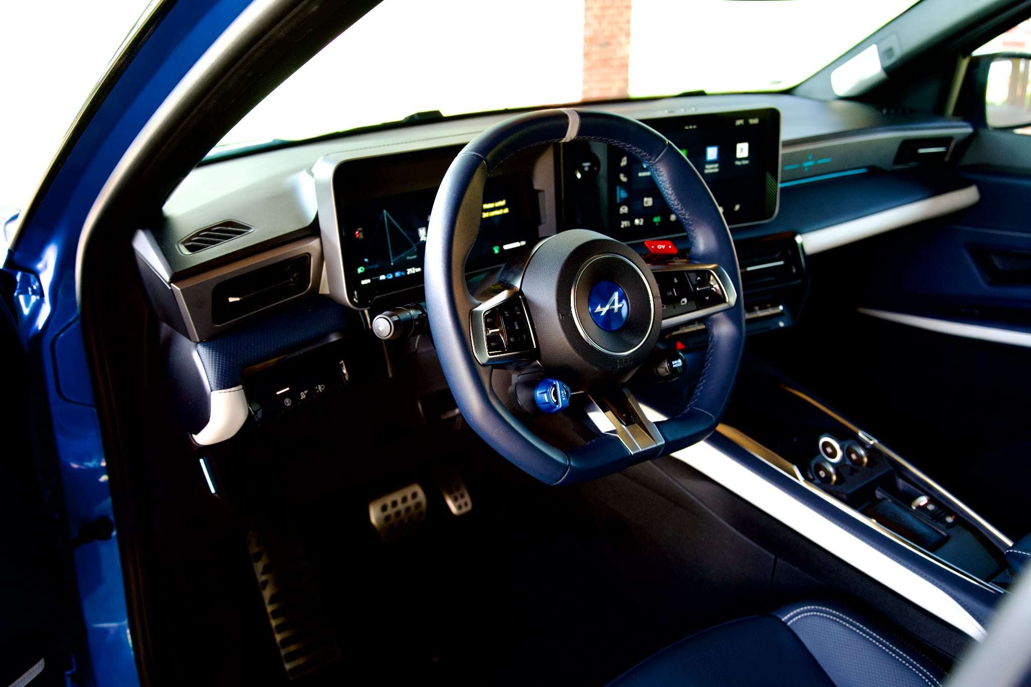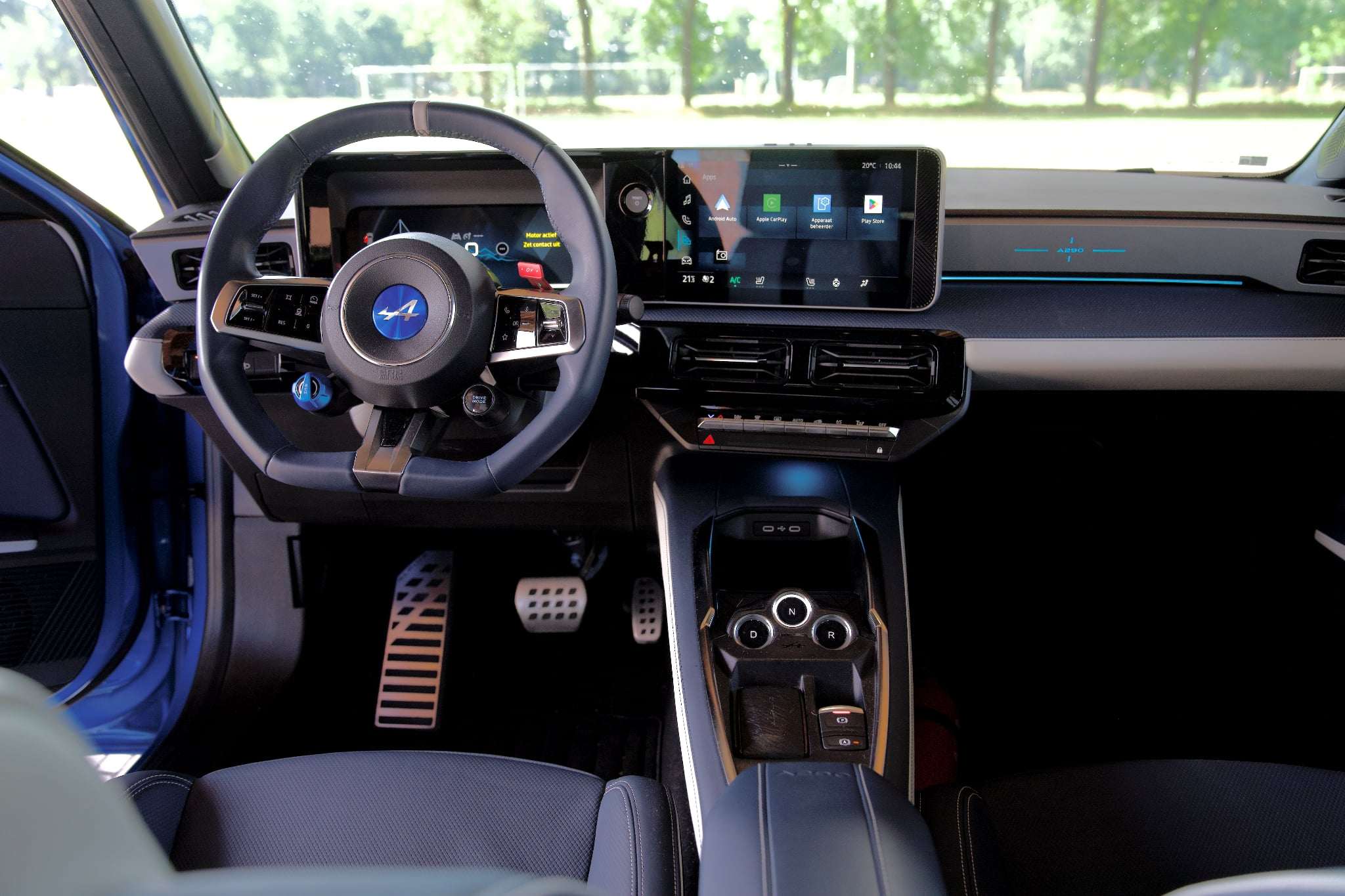 Binnenin geen futuristisch ruimteschip, maar een cockpit die rijders aanspreekt. Digitale tellers, een strak infotainmentscherm en een sportief middenconsole met knoppen in plaats van een brave pook. De sportstoelen zitten laag en stevig, het dikke stuur voelt alsof je in een A110, die we hier al eens meeritsten voor een toffe Alpenrit, zit.