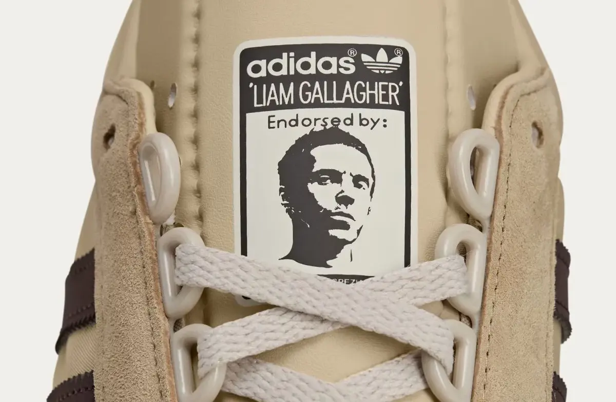 Waar Noel norse charme heeft, is Liam de koning van jolig en snedig. Zijn Achille SPZL is een ander model, uitgevoerd in beige met donkerbruine accenten – een beetje rock-’n-roll, maar net genoeg klassiek om op zondag bij je schoonmoeder te dragen. Ook hier prijkt de trotse Gallagher-kop op de tong. Zelfde deal: €130, alleen via loting in de Adidas Confirmed-app.