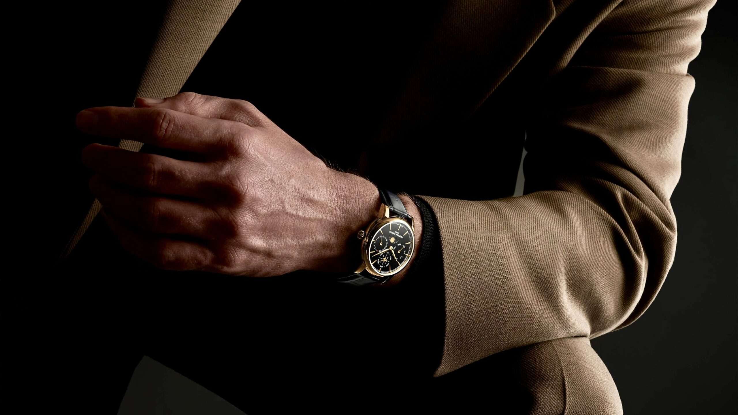 Qua looks is het klassieke klasse met een twist: dag, datum en maand overzichtelijk verdeeld in drie tellers, een elegante maanfase op zes uur, en een schrikkeljaarwijzer die z’n werk maar één keer per jaar doet (klinkt als jouw personal trainer). De zongestraalde wijzerplaten zorgen voor lichtspel en een cleane afleesbaarheid, terwijl de goud/onyx-versie pure “casino in Monaco”-vibes ademt.