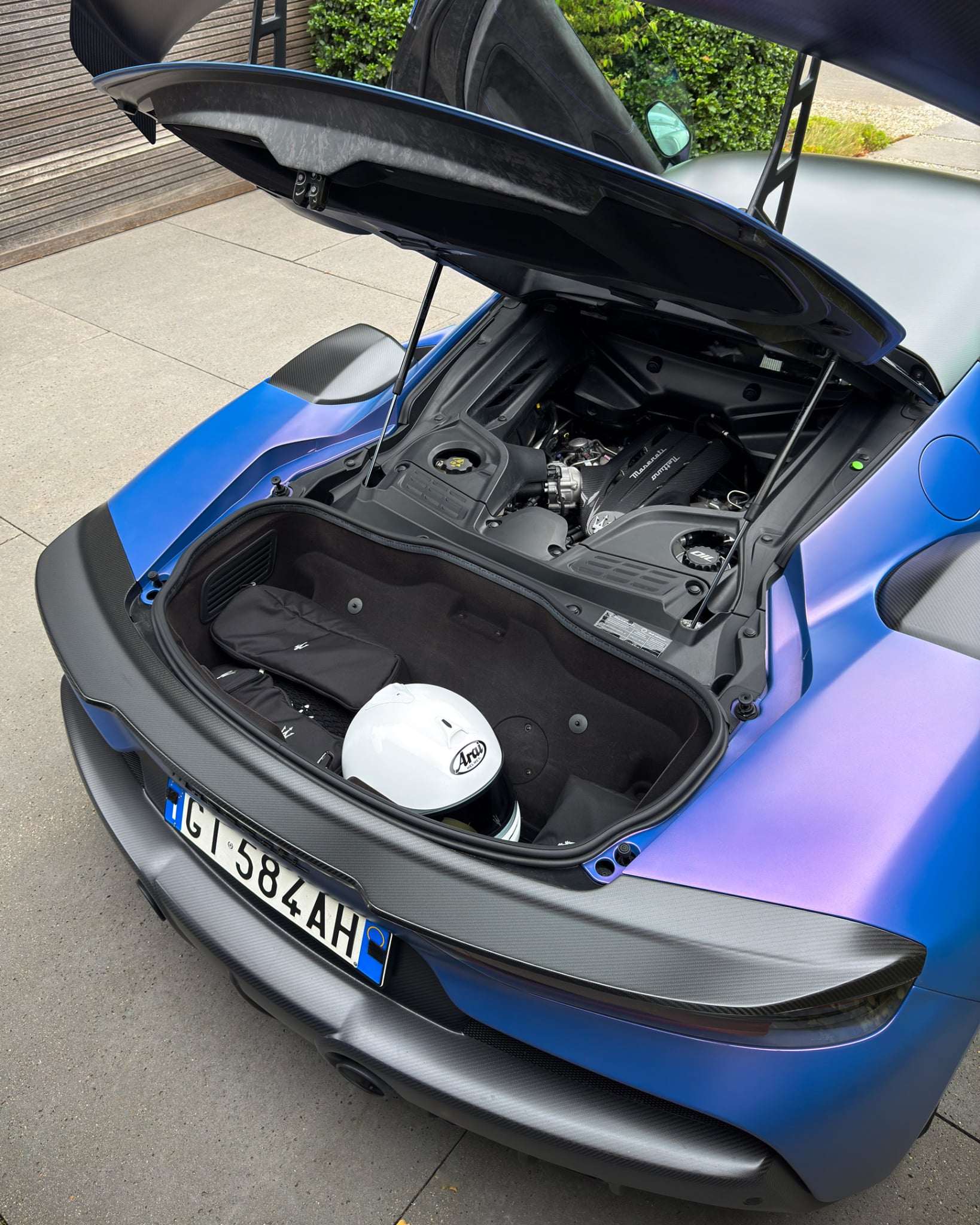 De Stradale kreeg een afslankkuur waar menig influencer jaloers op zou zijn. 60 kilo lichter, dankzij een koolstofvezel dak, motorkap en achtervleugel die zo groot is dat je er gerust een familiereünie barbecue op kan organiseren. Het totaalgewicht komt uit op 1.365 kilo, goed voor een sprintje van 0 naar 100 km/u in 2,8 seconden en een top van 324 km/u. En geloof ons: dat voelt alsof je brein een dubbel-shot espresso krijgen.