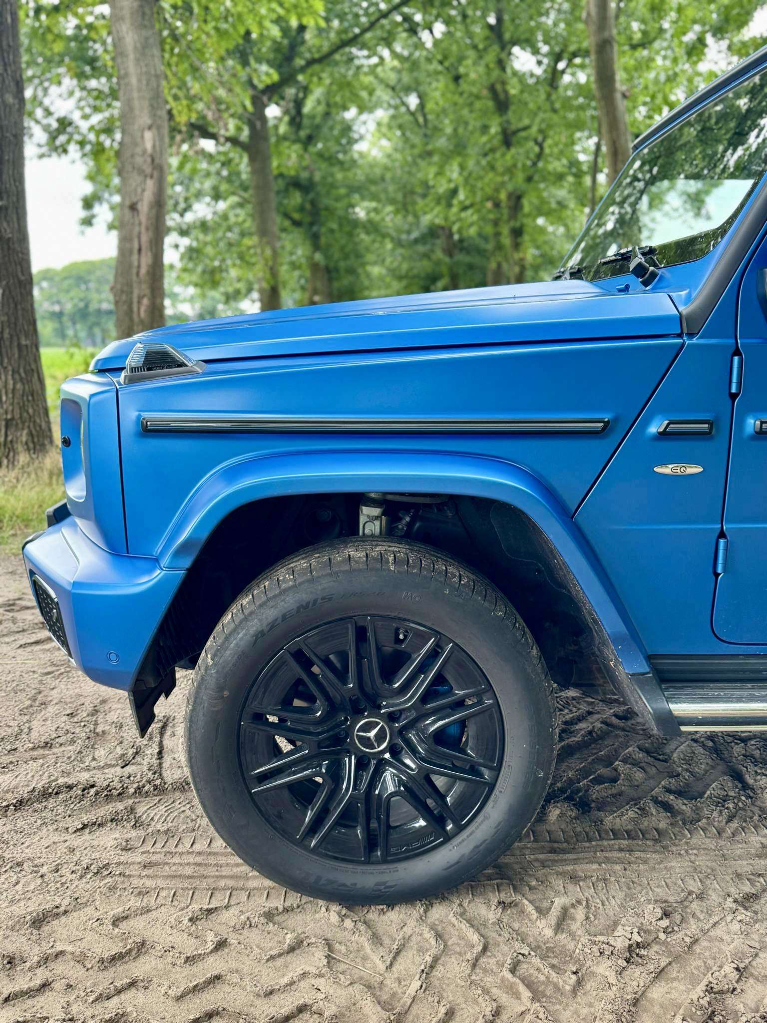 De G-Klasse bestaat al sinds 1979. 45 jaar later drinkt hij geen dinosap meer, maar stroom. Vier elektromotoren, samen goed voor 587 pk en 1.164 Nm, duwen dit gevaarte van ruim 3.085 kilo in amper 4,7 seconden naar 100 km/u. Da’s sneller dan een AMG G 63 – en geloof ons, dat ding is al geen slak.