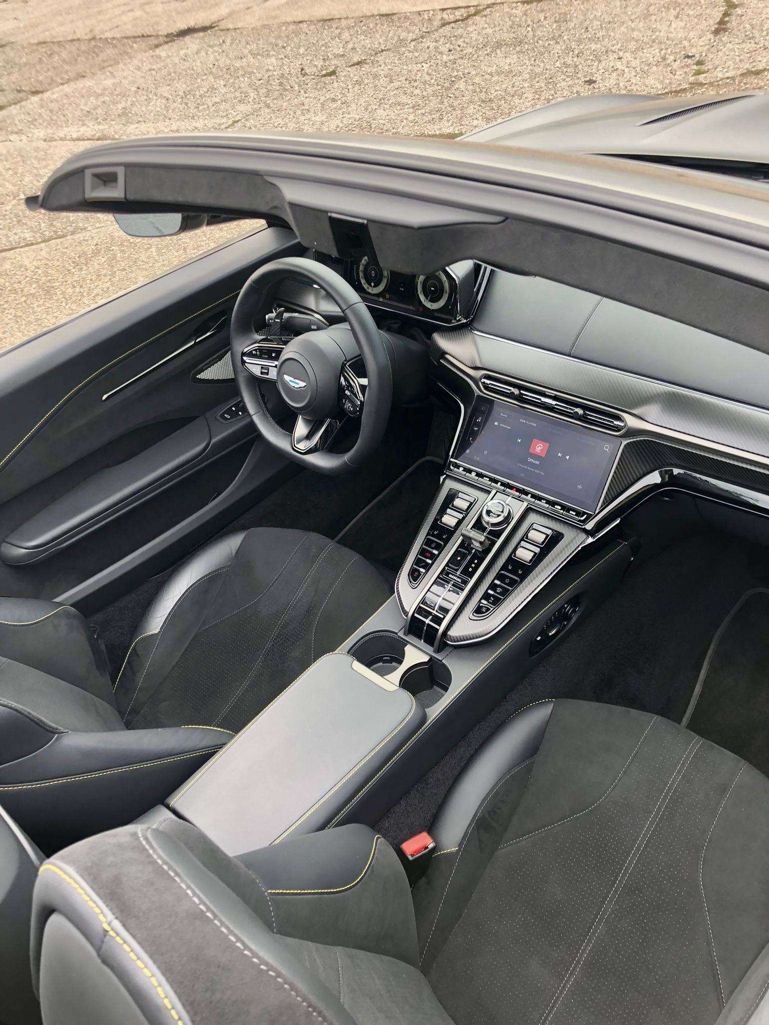 Verder maakt de Aston Martin Vantage Roadster natuurlijk ook veel indruk met zijn hoog niveau van afwerking en verfijning in een interieur dat leder, alcantara, hout en carbon op een zeer geslaagde manier combineert. Uiteraard kan de aankleding volledig naar wens van de klant gebeuren als hij dat verkiest en er het nodige extra budget voor wil uittrekken. Je eigen logo of naam stansen op de hoofdsteunen die overtrokken werden met Nappa-leder in je favoriete tint is dus perfect mogelijk. Gewoon vooraf even overleggen met Freddy Loix die het Aston Martin dealership in Brussel runt.