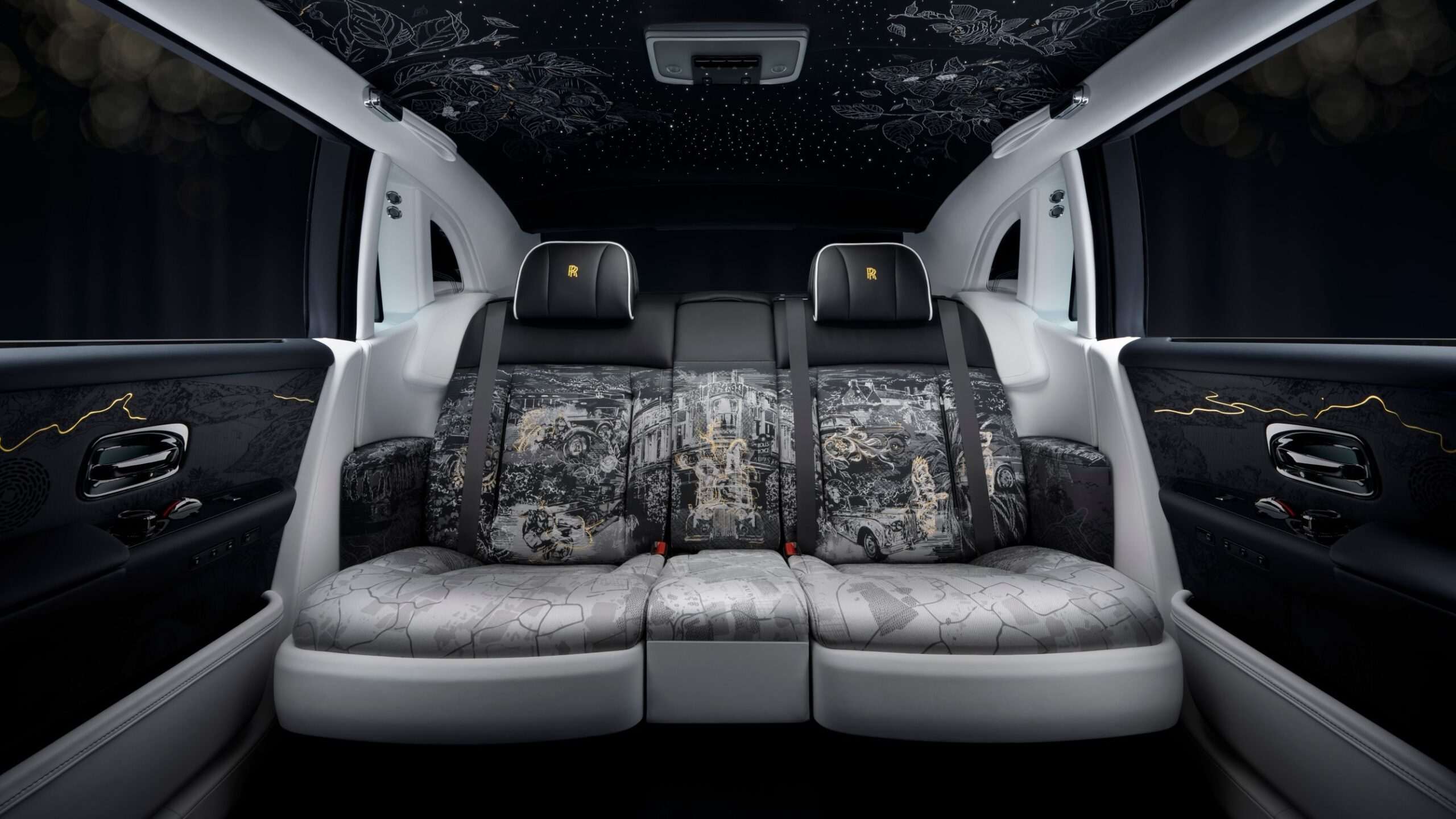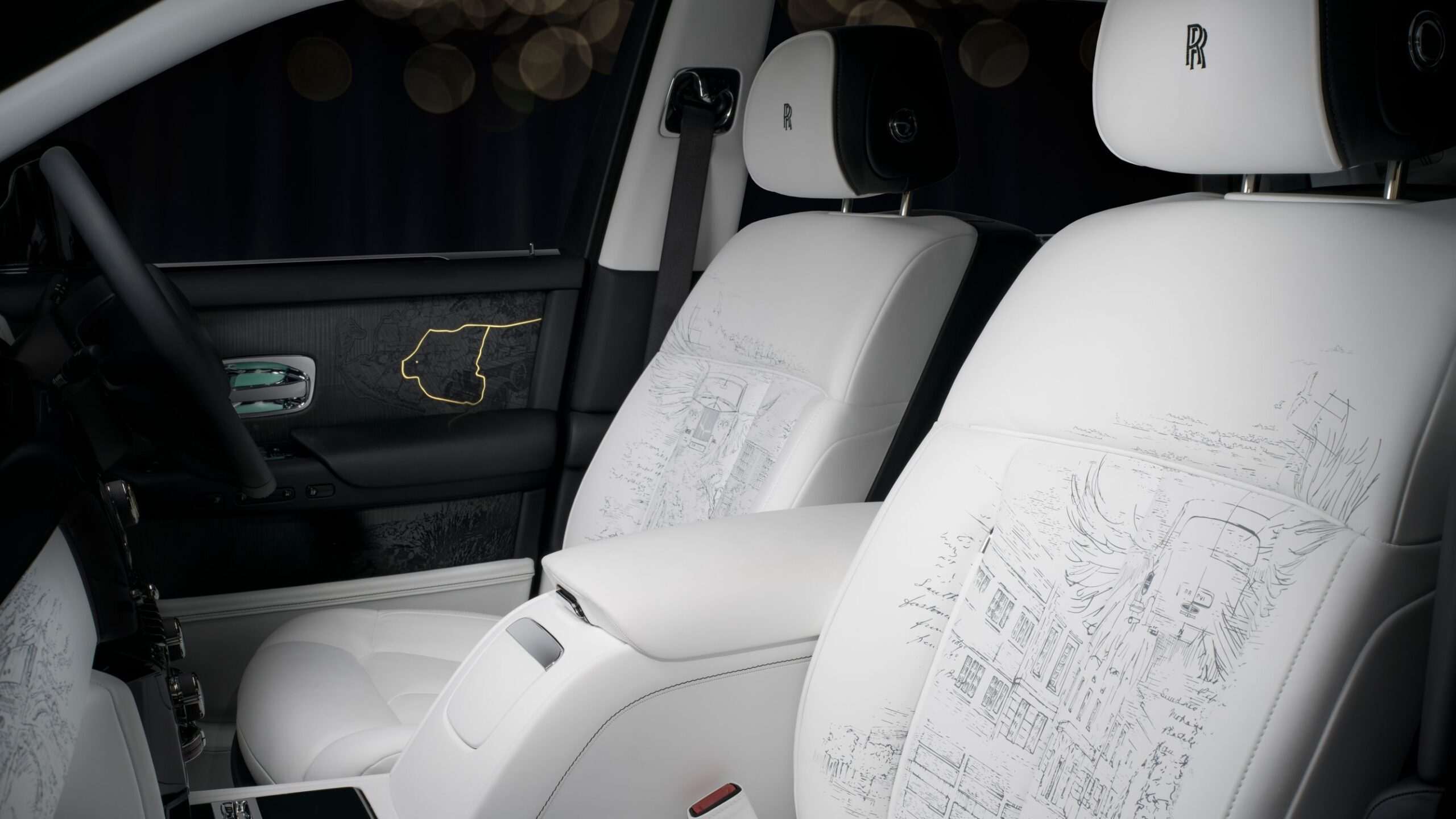 Open de deur, en je stapt niet zomaar in een auto — je betreedt een salon waar Chanel en Da Vinci een gezamenlijke collab lijken te hebben gedraaid. De stoelen combineren handgestikt leer met couture-achtige stoffen en borduursels die de rijke geschiedenis van de Phantom uitbeelden. In totaal 160.000 steken, verspreid over 45 panelen. En ja, zelfs de Starlight Headliner — het iconische verlichte dak — kreeg een update met 440.000 steken, verwijzend naar de Phantom Rose en andere Rolls-Royce-legendes.