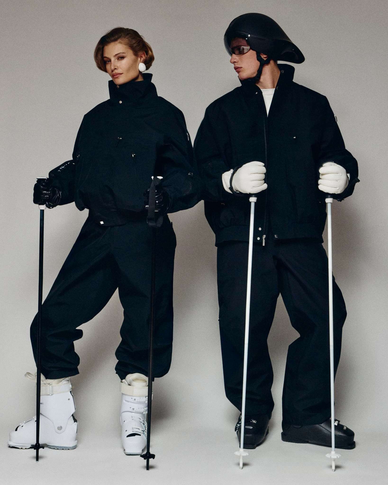 Voor mannen is er een sportief long-sleeve shirt dat zowel als base layer als solo piece werkt, inclusief duimgaten. De klassieke Jacquemus-men’s shirt kreeg eveneens een bergwaardige update: waterafstotende stof, minimalistische ‘J’-loop achteraan en een subtiele chest pocket. Bij de vrouwen trekken een waterafstotende jumpsuit, high-waist leggings en een elegant bralette de aandacht — functioneel, flatterend en volledig ski-ready.