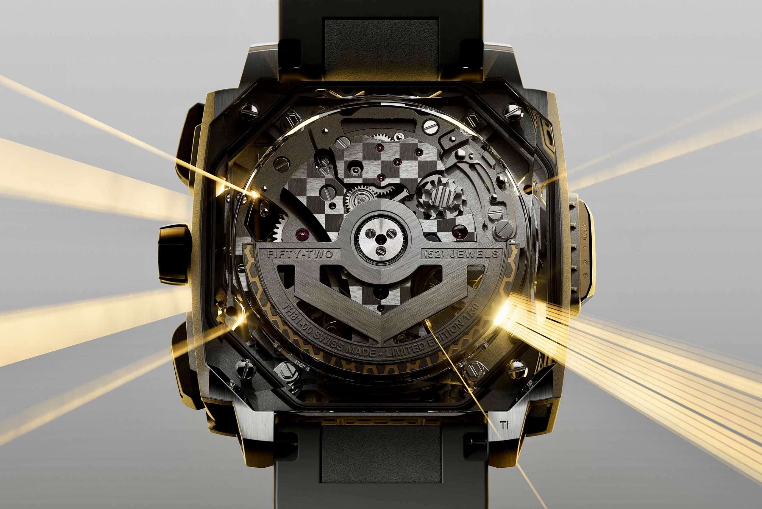 Het 41 mm Grade-5 titanium chassis wordt geproduceerd via Selective Laser Melting — dezelfde high-end additive manufacturing waarmee hypercar-onderdelen worden gemaakt. Het resultaat is een bijna holle, agressieve constructie, gevormd alsof het door luchtstroom zelf is uitgehouwen. De dubbele honingraatstructuur, geïnspireerd op motorroosters van hypercars, maakt het geheel nog brutaler. Titanium lattices, 2N geelgouden accenten en een zwarte DLC-bezel zorgen voor een combinatie van luxe en motorsport die geen enkel ander merk zo schaamteloos durft te maken.