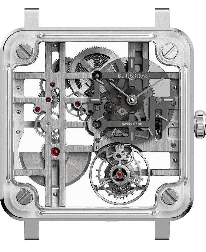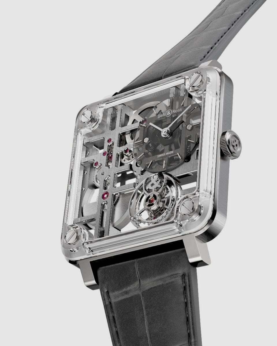 De klassieke Bell & Ross-vorm wordt in de BR-X3 volledig opengebroken — letterlijk. De stalen middenkast wordt gevat tussen een saffieren voor- en achterkant, waardoor het uurwerk als een zwevend architecturaal object aanvoelt. Vier herkenbare schroeven houden het geheel samen, maar verder is álles transparant.