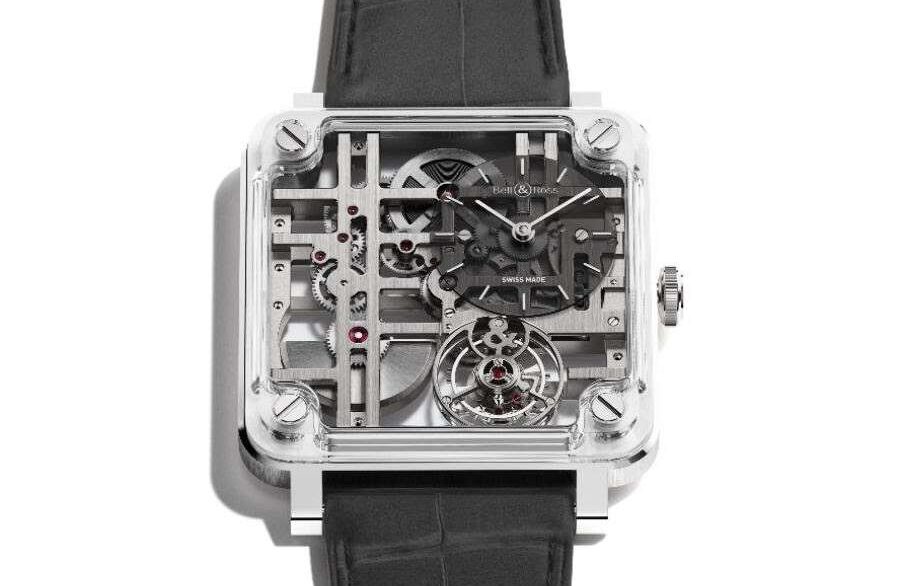 De klassieke Bell & Ross-vorm wordt in de BR-X3 volledig opengebroken — letterlijk. De stalen middenkast wordt gevat tussen een saffieren voor- en achterkant, waardoor het uurwerk als een zwevend architecturaal object aanvoelt. Vier herkenbare schroeven houden het geheel samen, maar verder is álles transparant.