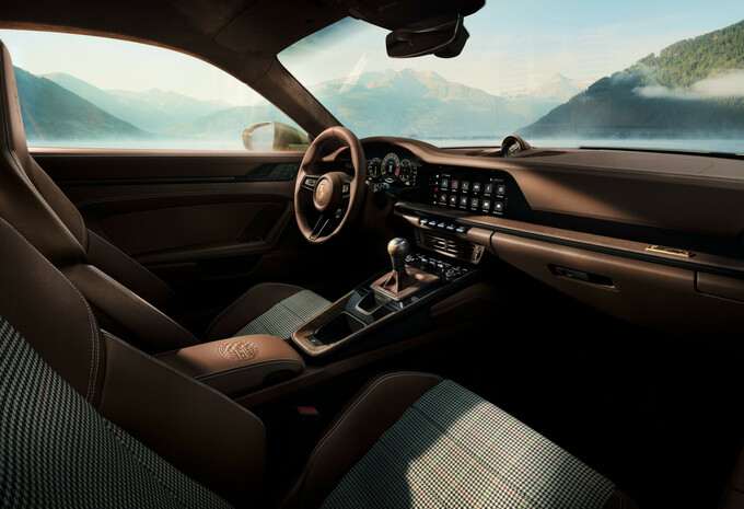 Binnenin wordt het eerbetoon nog tastbaarder. De stoelen zijn bekleed met F. A. Grid-Weave-stof, geïnspireerd op het patroon van Butzi’s favoriete jasje. Dat wordt gecombineerd met Truffle Brown Club Leather, contrasterend Chalk Beige stikwerk en een klassieke walnoten schakelpook — een detail dat vandaag bijna ondenkbaar is in een GT3, maar hier perfect werkt.