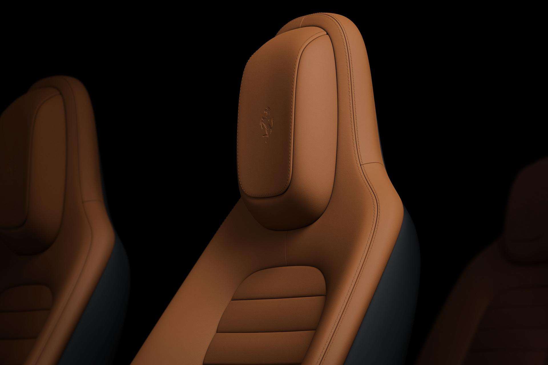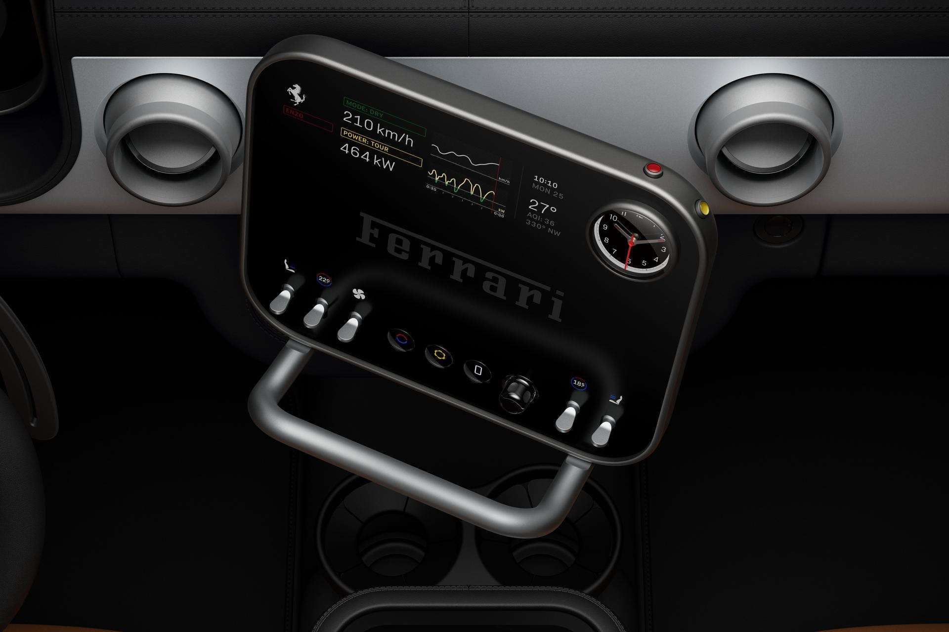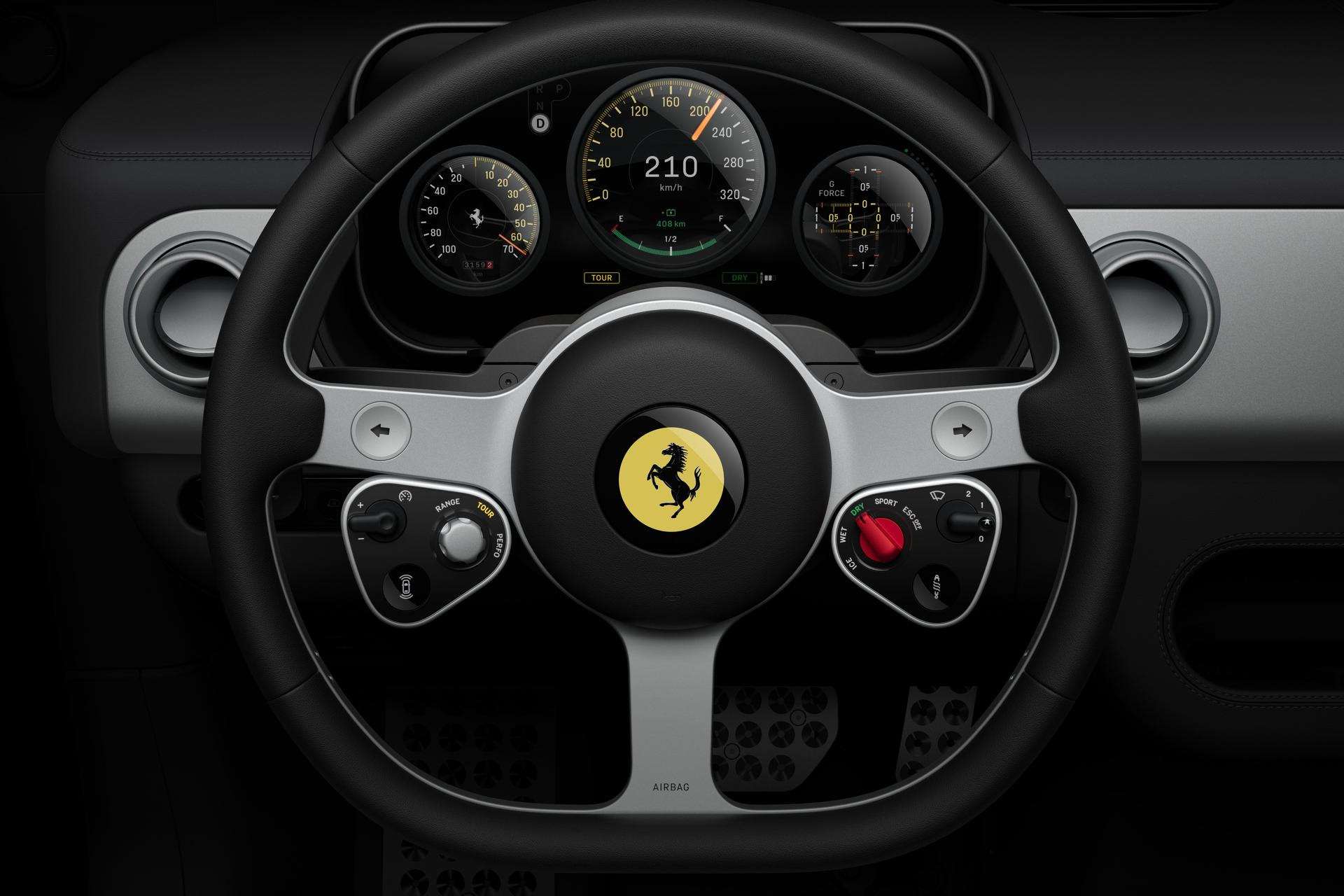 Het stuurwiel is een moderne interpretatie van het klassieke driespaaks Ferrari-stuur uit de jaren ’50 en ’60, volledig in gerecycleerd aluminium en met analoge bedieningsmodules die doen denken aan een F1-stuur. De displays bewegen mee met het stuur, de centrale bediening zit op een kogelgewricht en zelfs de sleutel — in speciaal krasbestendig glas met een E Ink-display — krijgt een theatrale rol bij het opstarten.