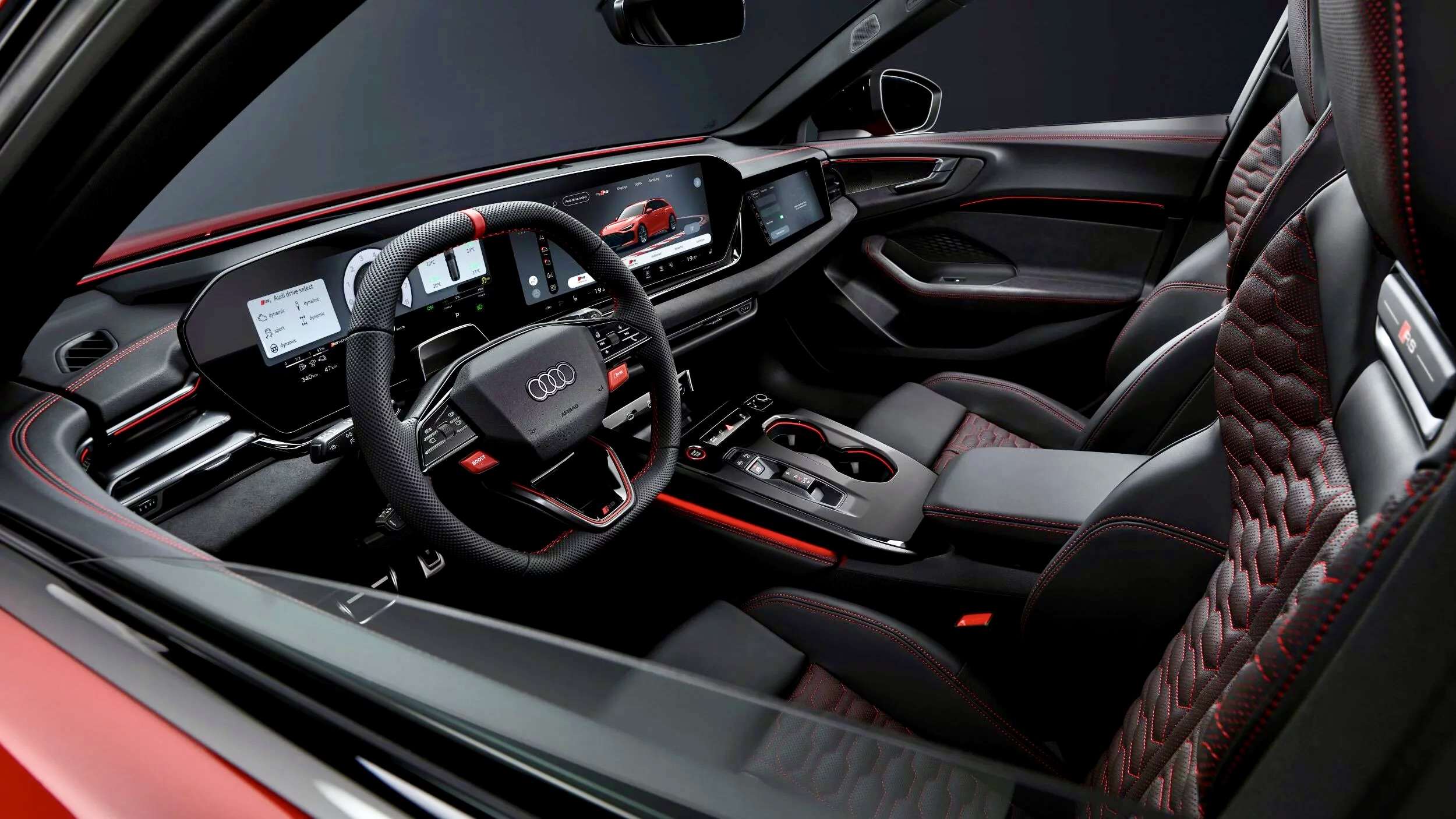 Matrix-ledkoplampen met RS-specifieke lichtsignatuur en optionele digitale OLED-achterlichten maken het plaatje high-tech af. Binnenin vind je sportstoelen, RS-displays met G-krachten, rondetijden en energiestromen, én een uitgebreid MMI-landschap dat meer weg heeft van een commandocentrum dan van een dashboard.
