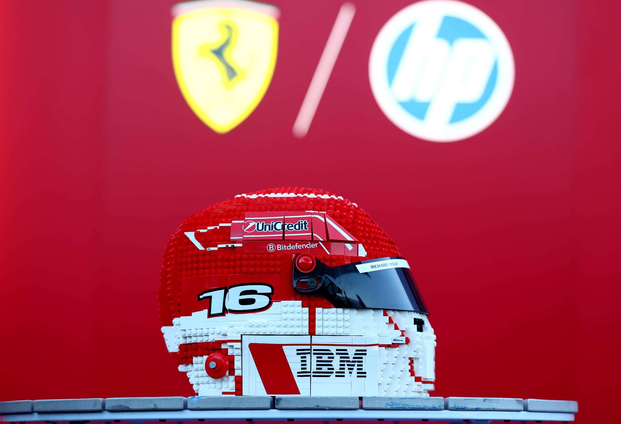 Charles Leclerc krijgt een 886-delige set die zijn herkenbare Ferrari-helm nauwkeurig reproduceert.