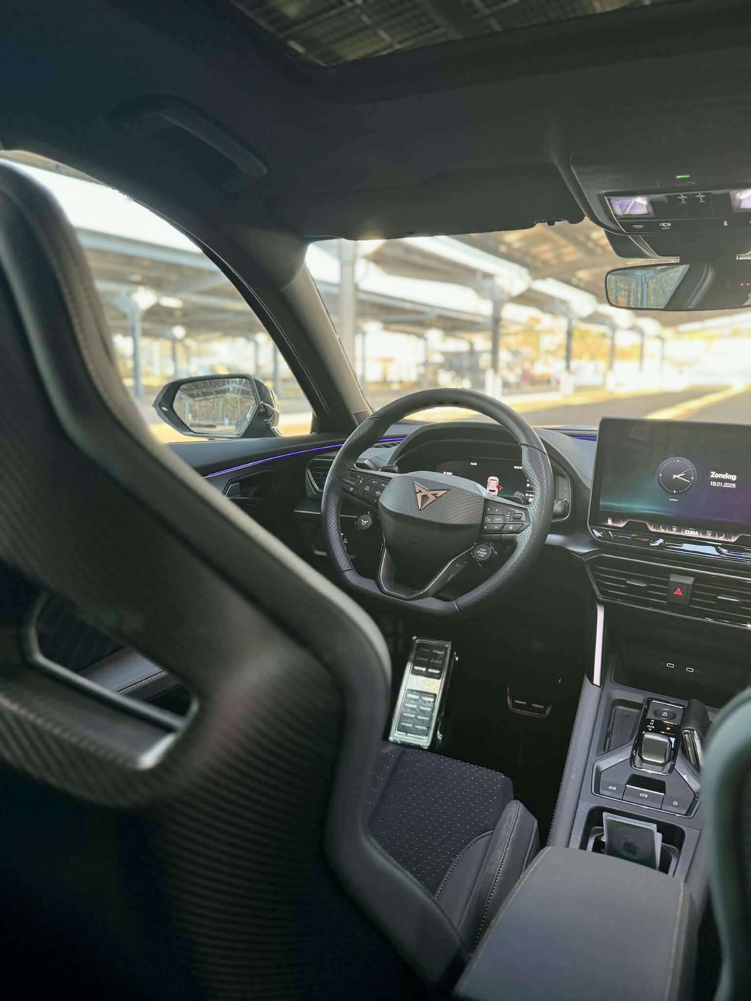 De sfeer is uitgesproken premium zonder afstandelijk te worden. In de VZ Performance-uitvoering nemen Sabelt-kuipstoelen je stevig maar comfortabel in ontvangst. Ze geven niet alleen steun wanneer de weg bochtig wordt, maar versterken ook dat sportieve gevoel nog voor je vertrokken bent. Het stuur ligt perfect in de hand, een detail waar Cupra ondertussen een reputatie in heeft opgebouwd.