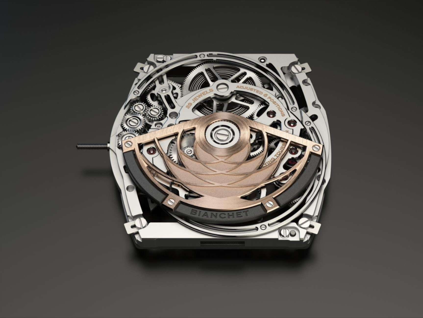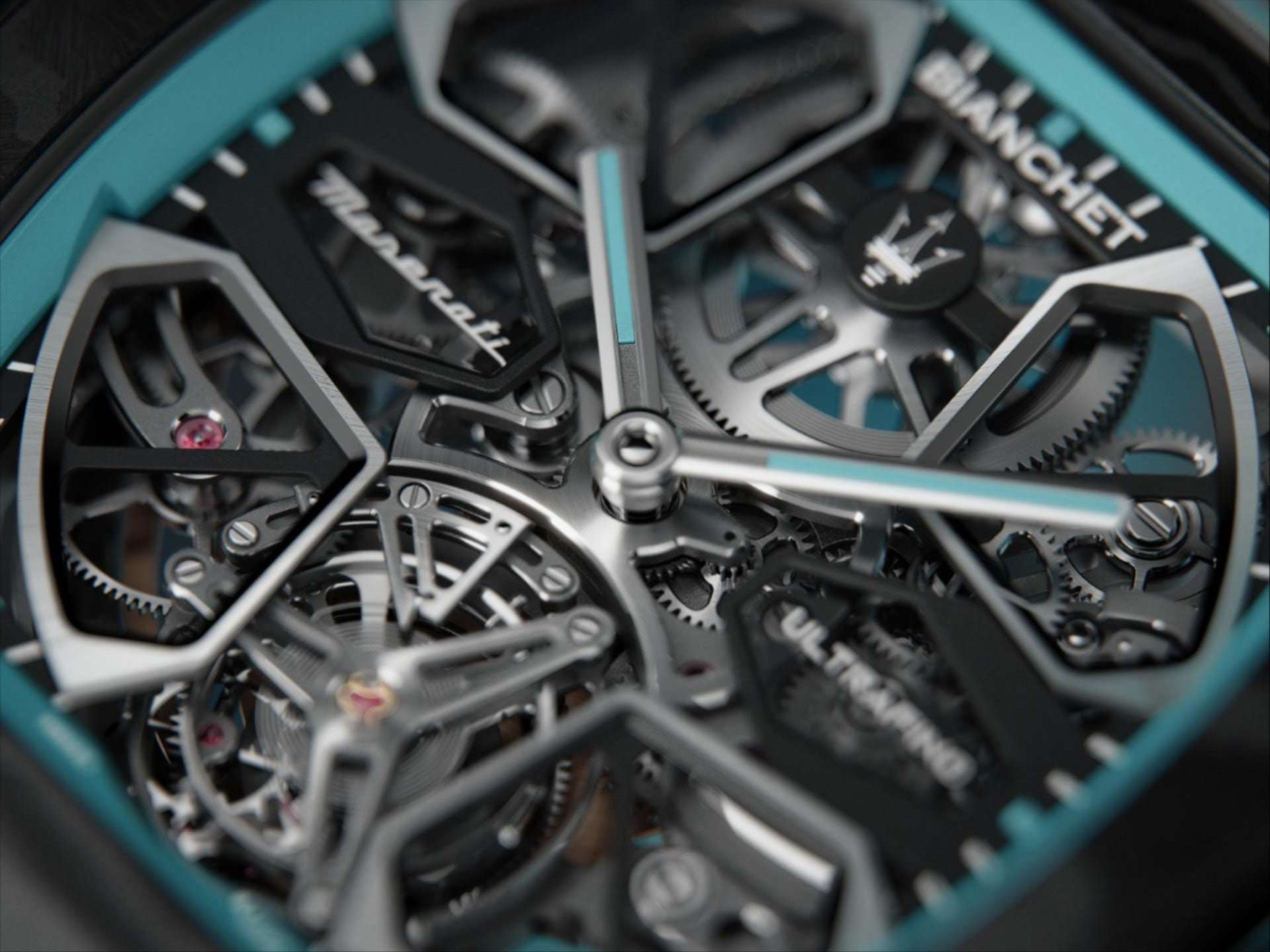 Onder de motorkap, of beter: onder het saffierglas, zit het Bianchet UT01 kaliber. Met een dikte van amper 3,85 mm is het een technisch huzarenstukje. De vliegende tourbillon, volledig zichtbaar, vormt het kloppend hart en wordt met de hand afgewerkt tot in de kleinste details.