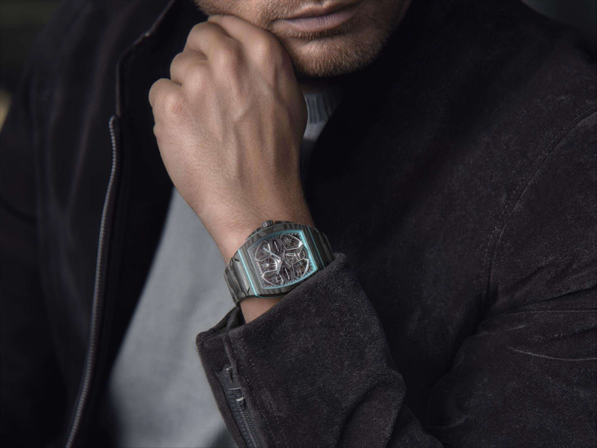 Het horloge haalt zijn visuele en technische inspiratie uit de Maserati MCPURA, een recente supercar die indruk maakt met zijn lichte carbonstructuur en krachtige V6 biturbo. Die invloed zie je meteen terug: de opengewerkte wijzerplaat verwijst naar het stuurdesign van de wagen, terwijl materialen als carbon en titanium de link met autosport tastbaar maken.